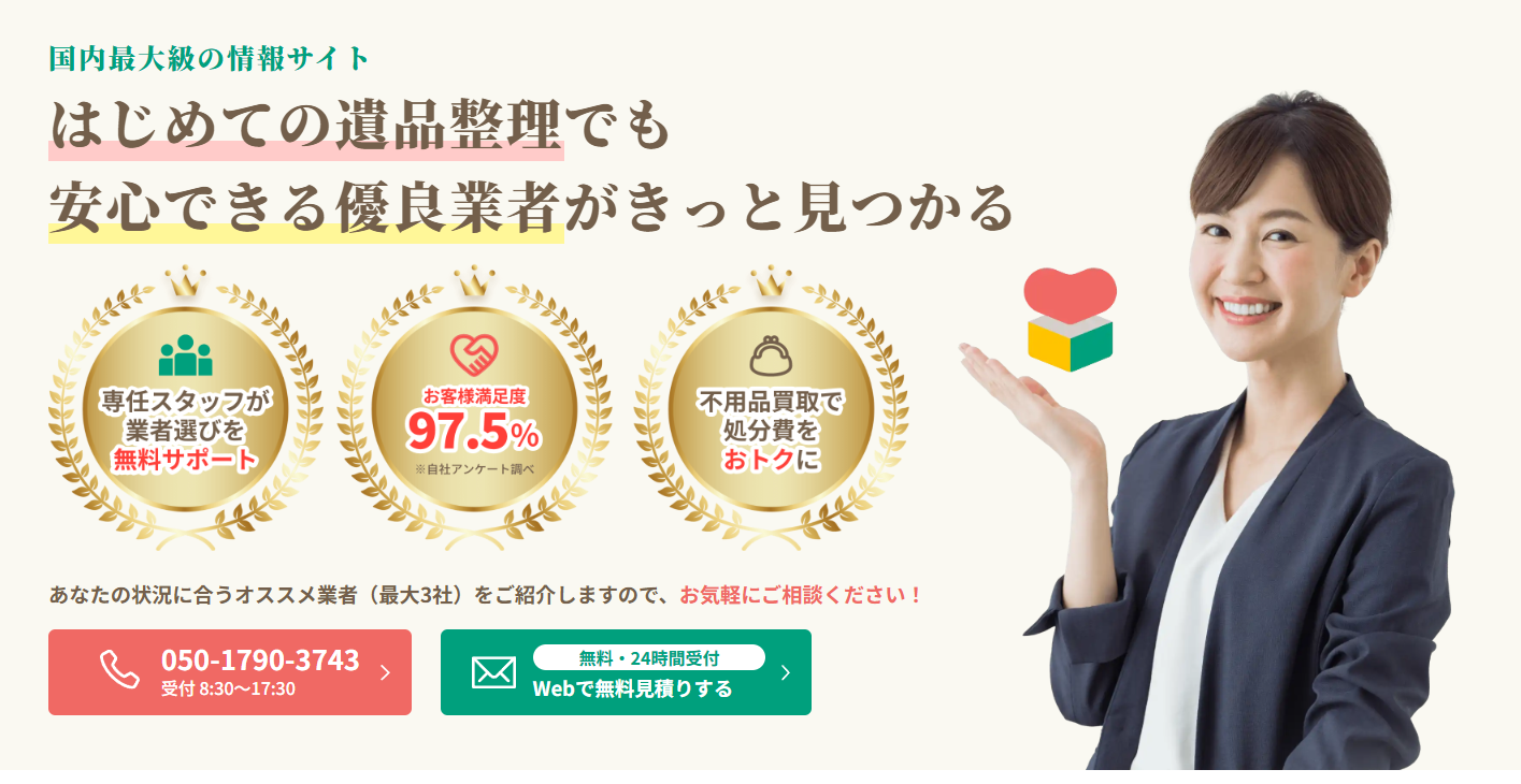 遺品整理や生前整理、実家片付けなどの業者探しなら遺品整理の相談所。全国の遺品整理士等の資格を持つ適正業者と提携しており、ご希望の条件に適した業者が見つかります。遺品整理のお悩みなども専任スタッフが無料で電話サポートするのでご安心ください。