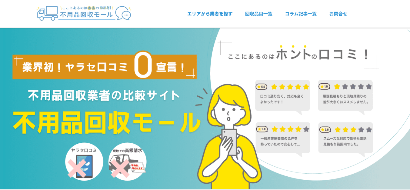 「不用品回収モール」は、業界初の"ヤラセ口コミ0宣言"を掲げた不用品回収業者の比較サイトです。