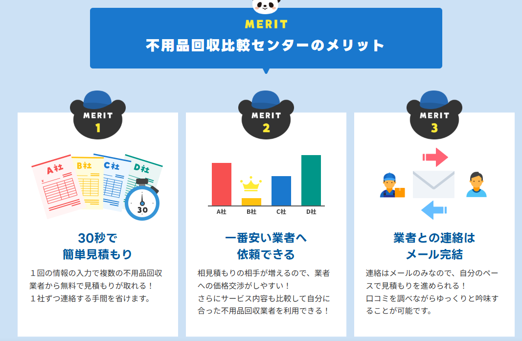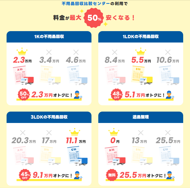 全国で不用品回収比較業者をお探しの方は、不用品回収比較センターのご利用を検討してみてください。
