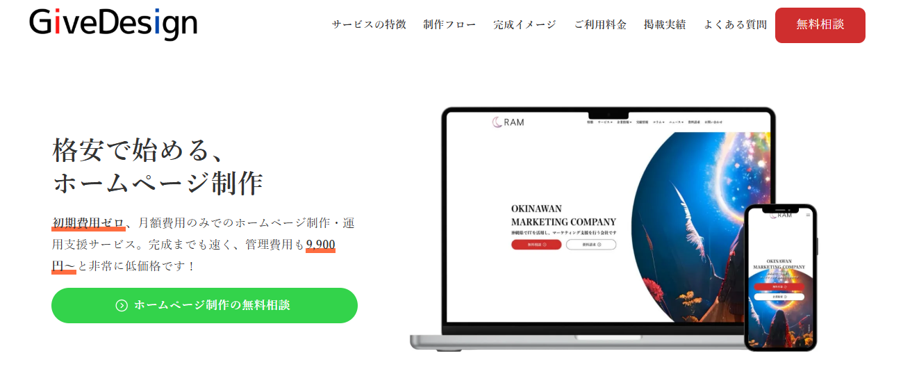 格安・サブスク形式のホームページ制作サービスGiveDesignは、初期費用をかけずにホームページを持ちたい方に最適なサービスです。納期を短くして制作することもできるので、短期間で仕上げたい場合にもおすすめです。
