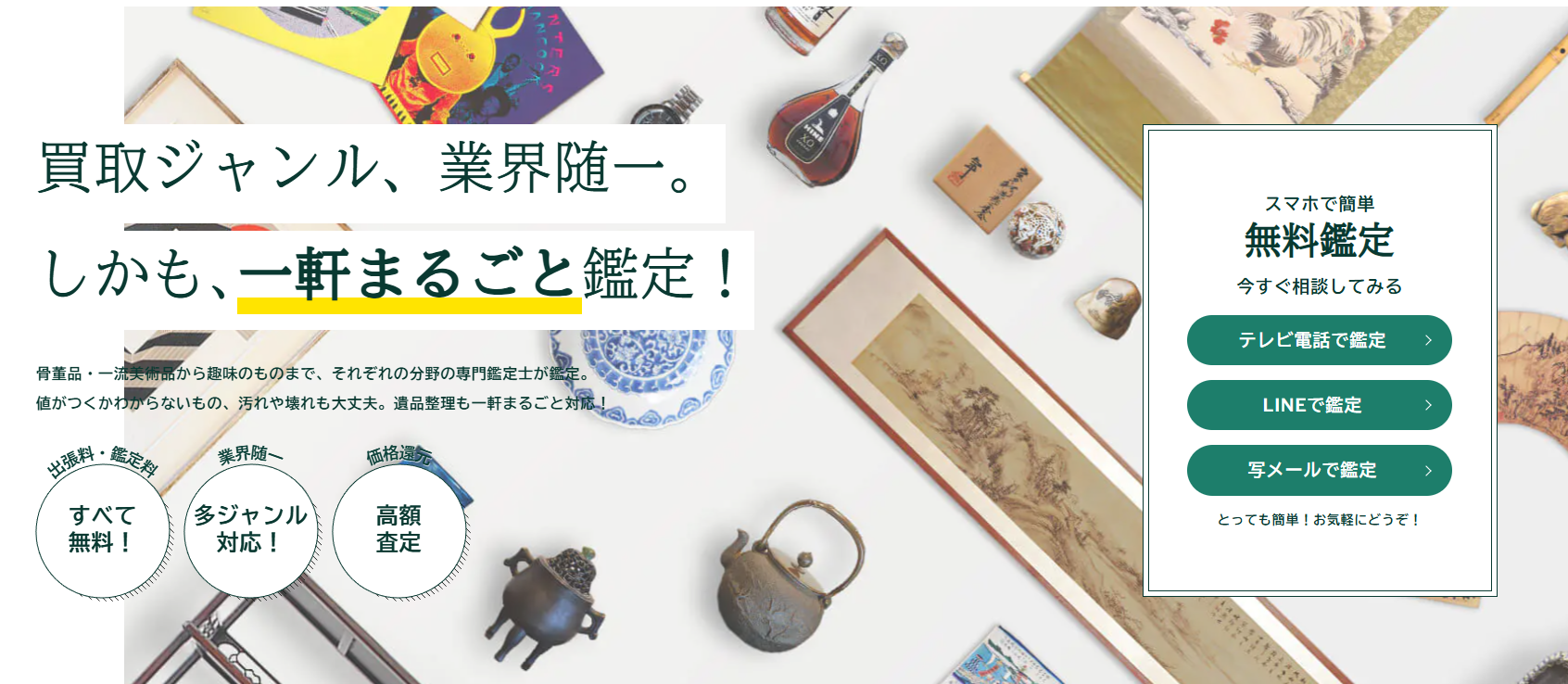 「あい古物買取サービス」では、骨董品や古道具、趣味の道具、家財品などを対象に、出張買取や家丸ごと一軒鑑定サービスを提供しています。各ジャンルに専門スタッフが在籍し、幅広い品目に対応可能です。個人のお客様から法人様まで、多様なニーズにお応えしております。