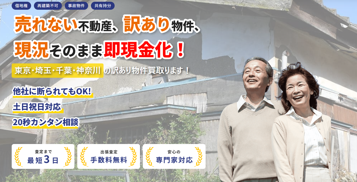 「訳あり物件買取センター」は、東京・埼玉・千葉・神奈川に対応し、借地権・再建築不可・事故物件・共有持分・底地などの“訳あり物件”を直接買取。無料査定・出張費0円で、最短1ヶ月のスピード成約を目指します。無料相談OK。